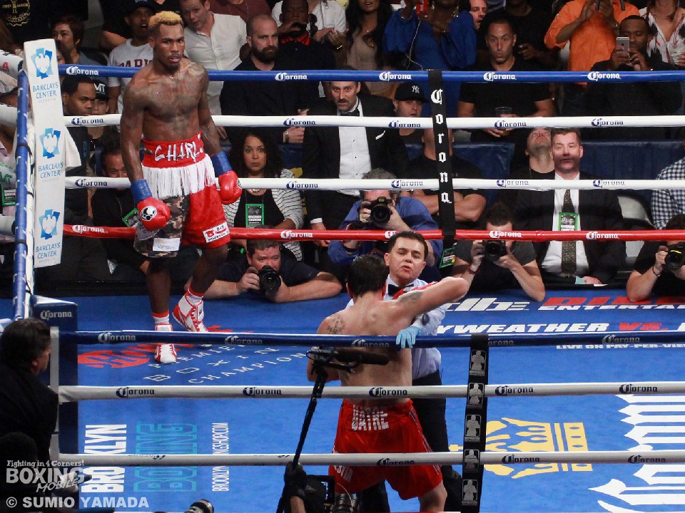 セミではジャモール・チャーロ(米)対ホルヘ・ヘイランド(亜)のWBCミドル級挑戦者決定戦が行われ、前IBF(国際ボクシング連盟)スーパーウェルター級王者のチャーロが4回2分13秒TKO勝ちを収めた。チャーロは2回にサウスポーのヘイランドに右を浴びせてダウンを奪い、4回には左フックでダウンを追加。ここも立ったヘイランドだがダメージは深刻で、セコンドが棄権の意思表示をして試合が終わった。26戦全勝(20KO)のチャーロはWBC王座への挑戦権を手にしたが、9月16日に行われるゲンナディ・ゴロフキン(カザフスタン/米)対サウル・カネロ・アルバレス(メキシコ)の結果によっては同王座が空位になる可能性もあり、先行きは不透明といえる。ヘイランドは36戦29勝(16KO)5敗2分。