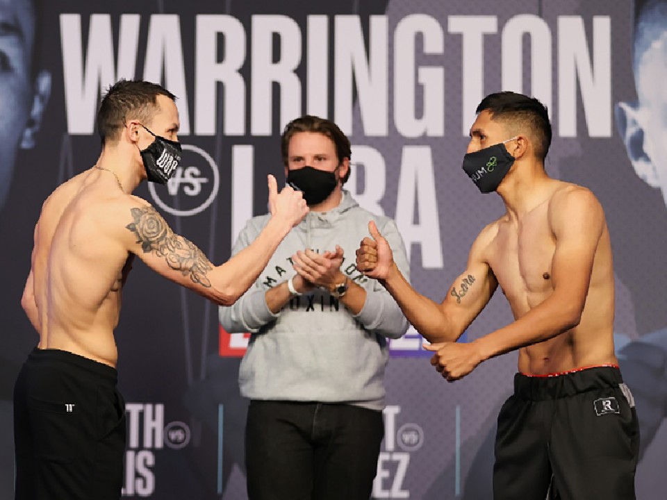 フェザー級リミット57.1kgを両者とも400gアンダーの56.7kgで合格した。ウォーリントンは当初、WBA(世界ボクシング協会)王者シュー・ツァン(26=中国)とのフェザー級王座統一戦が内定していた。しかし、WBAの同級スーパー王者にレオ・サンタ・クルス(32=メキシコ)が君臨するため、IBFはツァンを正規王者として認めず統一戦は消滅。ウォーリントンはIBF王座を返上して、現在10連勝中の若手メキシカンのララを相手に無冠戦を行うことになった。