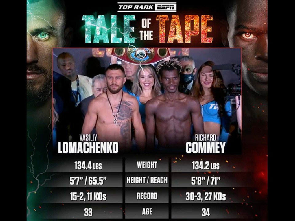 再起2戦目を迎える元3階級制覇王者ワシル・ロマチェンコ(33=ウクライナ)と元IBFライト級王者リチャード・コミー(34=ガーナ)が日本時間の11日、WBOインターコンチネンタル・ライト級王座決定戦の前日計量を終えた。試合は米国・NYのマジソン・スクエア・ガーデン・Huluシアターで11日(日本時間12日)に開催される。