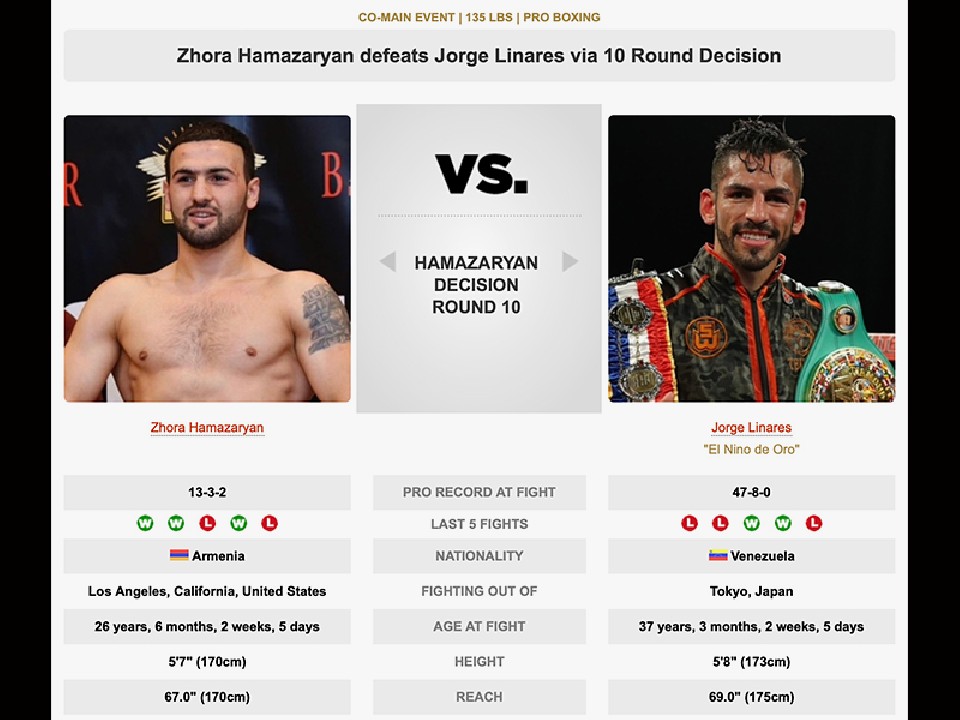 序盤に鋭いコンビネーションを見せたリナレスに対し、アマサリャンはプレッシャーをかけて行く。アウトボクシングが機能していたリナレスだったが、徐々に疲労を重ねて、足が重くなると、アマサリャンがクリーンヒットを中盤から奪っていった。パワーで上回るアマサリャンは、プレスを強めて強打を打ち込むと、リナレスは、ディフェンシブに動いて、試合終了のゴング。判定は、3-0(96-94、98-92、99-91)で、アマサリャンが勝利した。