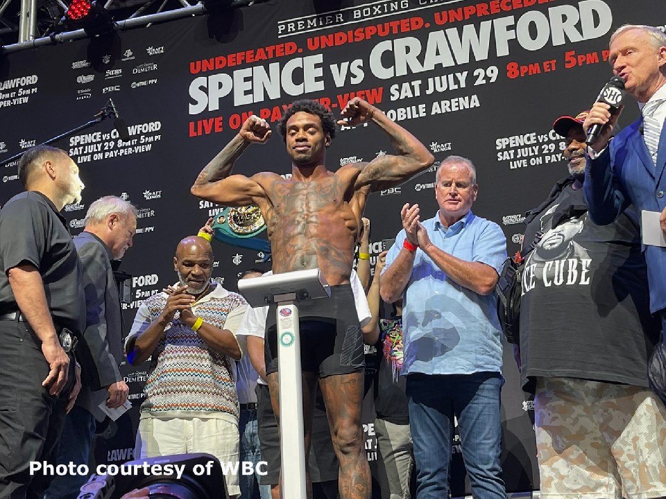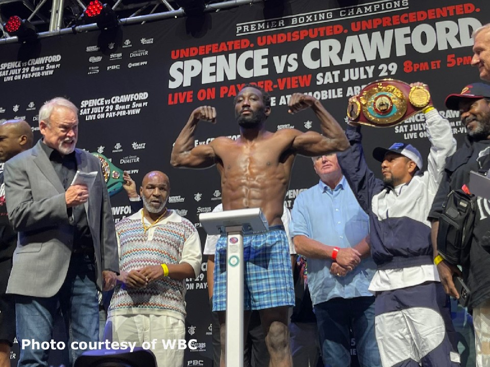 ウェルター級世界4団体王座統一戦の前日計量が現地時間の28日、米国ラスベガスで行われ、WBA・WBC ・IBF3団体王者のエロール・スペンスJr.(33=米国)は147lb(66.6kg)、WBO王者のテレンス・クロフォード(35=米国)は146.8lb(66.5kg)でクリアした。