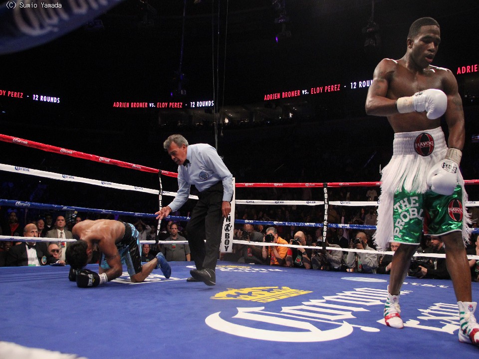 早々から威力のある左フックで挑戦者を脅かしたブローナーは、その後も右ストレート、左右のアッパーも交えた攻撃でペレスを圧倒。4回、右ストレートでペレスにダメージを与えると、すかさず右の広角打をフォロー。挑戦者を顔面からキャンバスに送り込んだ。