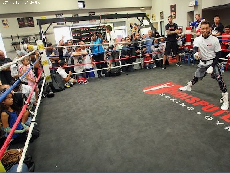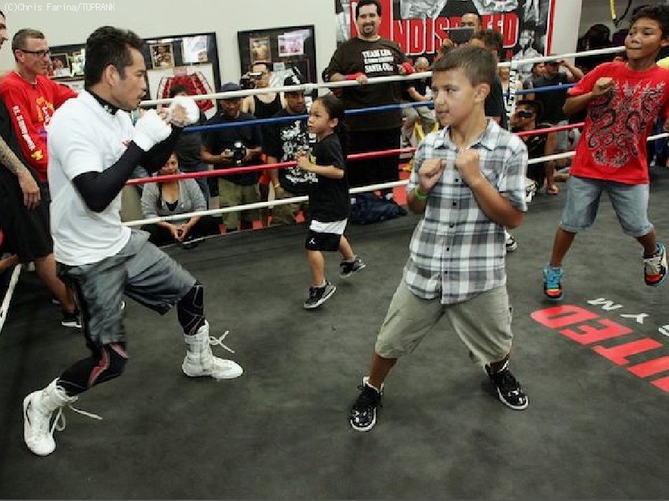 ジムのブライアン・シュワルツ代表を相手にミット打ちや、ファンとの質問コーナー、集まった子供たちにボクシングレッスンを行うなど、ドネアらしい和やかな雰囲気の公開練習を行った。