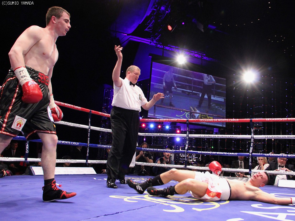 迎えた3回2分過ぎ、ゴロフキンは左で追い立て、石田の上体が伸びたところに強烈な右フックをヒット。この一撃で石田はロープの間から上半身がエプロンに飛び出すほどの痛烈なダウンを喫した。誰が見ても10秒以内に立ち上がれないのは明らかで、レフェリーはノーカウントで即座に試合をストップした。その後、石田は立ち上がり、リングをあとにした。