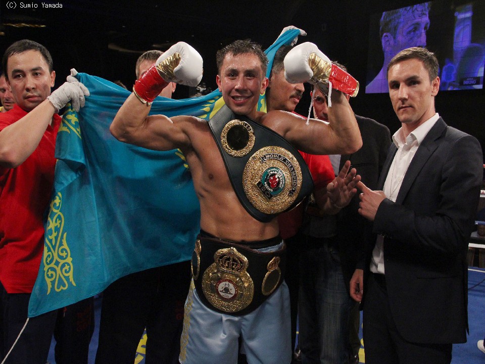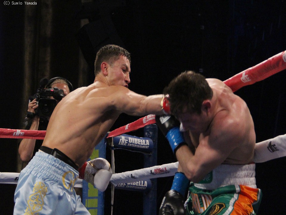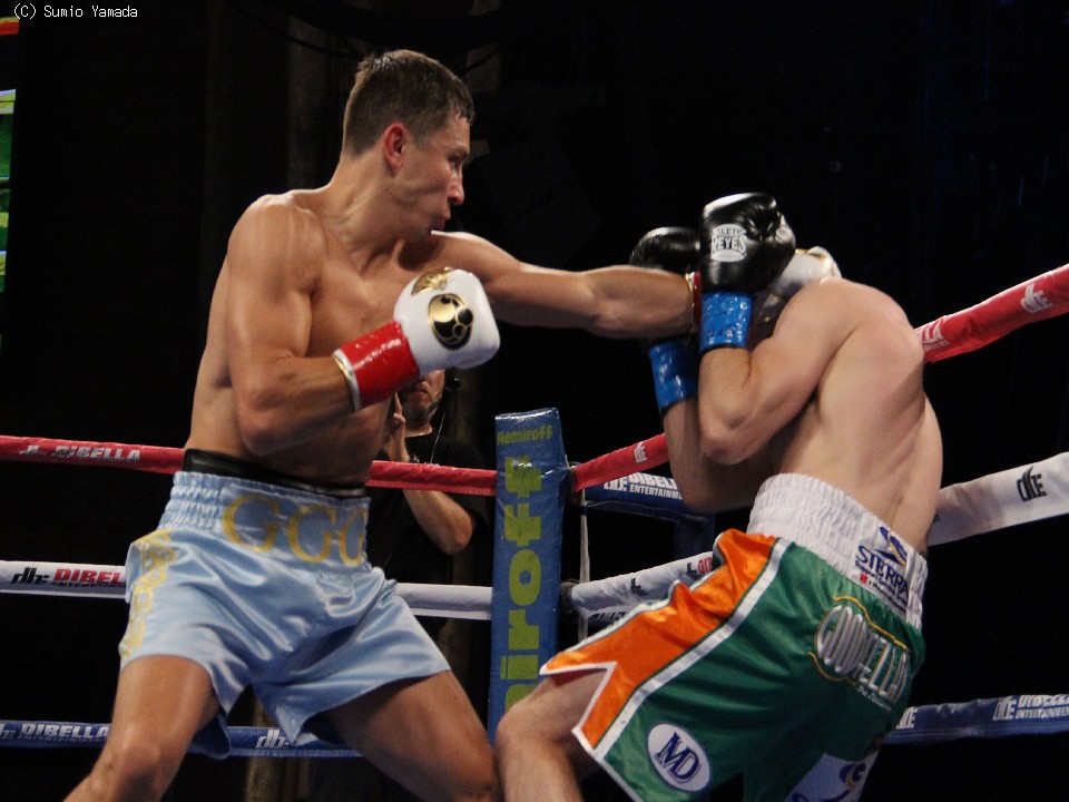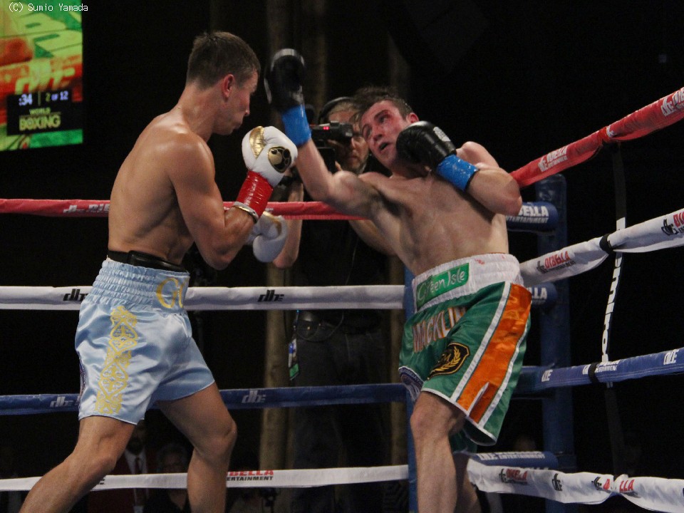 淵上誠(八王子中屋)、石田順裕(グリーンツダ)らを含む8人の挑戦者全員を規定ラウンド内で沈めてきたゴロフキンは、これで27戦全勝(24KO)。連続KOも14に伸ばした。フェリックス・シュトルム(独)、セルヒオ・マルチネス(亜)に挑戦したこともあるマックリンは、3度目の挑戦も実らず34戦29勝(20KO)5敗となった。