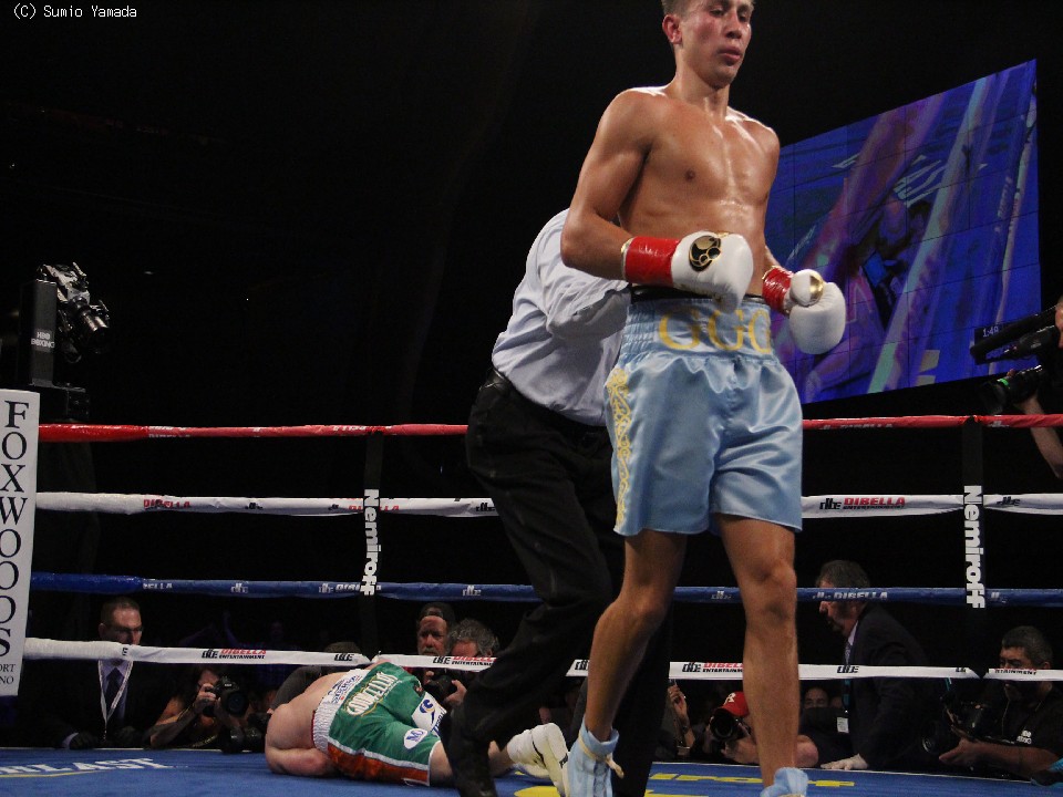 主導権は自然に王者のもとに転がり込み、挑戦者は早々と追い込まれてしまう。2R、後退が目立つマックリンは左目上をカットする不運も重なり、厳しい状況に立たされた。迎えた3R、ゴロフキンは英国人を追い立て、ロープを背負わせたところで左のボディブローを一閃。これが脇腹にめり込み、マックリンはキャンバスに横転。そのままレフェリーのカウントを聞かされた。