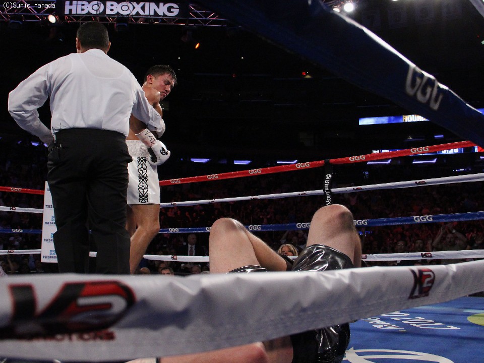オッズは試合直前になって12対1から9対1に差が縮まったものの、圧倒的にゴロフキン有利の声が多かったことに変わりはなかった。その予想どおり王者がパワーの差をみせつけた。初回、ゲールは右目上をカットするなど早々から厳しい状況に追い込まれた。2回、ゴロフキンは挑戦者をロープに追い込んで左右を連打。最後は右を打ち下ろして先制のダウンを奪った。迎えた3回終盤、ゴロフキンが左右のコンビネーションで追い立てると、手負いのゲールも右をヒット。このパンチでゴロフキンはのけぞったものの、その体勢から右を捻じ込んで2度目のダウンを奪った。背中からキャンバスに叩きつけられたゲールは10カウント内に立ち上がったが、足元が定まらずレフェリーからストップを言い渡された。ゴロフキンは11連続KO防衛を果たすとともに、無冠時代の08年からマークしている連続KOも17に伸ばした。敗れたゲールは33戦30勝(16KO)3敗。ゲールはアマチュア時代の01年、大阪で開催された東アジア大会ウェルター級決勝でゴロフキンに15対3のポイント負けを喫しているが、13年越しの雪辱はできなかった。