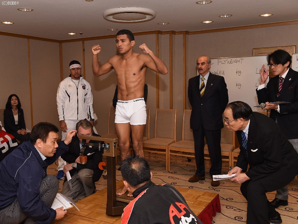 フライ級リミットの50.8kgでパスした王者ゴンサレスに対し、挑戦者フエンテスは500gアンダーの50.3kgでクリア。過去にスパーリングで手合わせをしたこともある旧知の二人は、計量後の撮影では王者から挑戦者を引き寄せ肩を抱き合った。