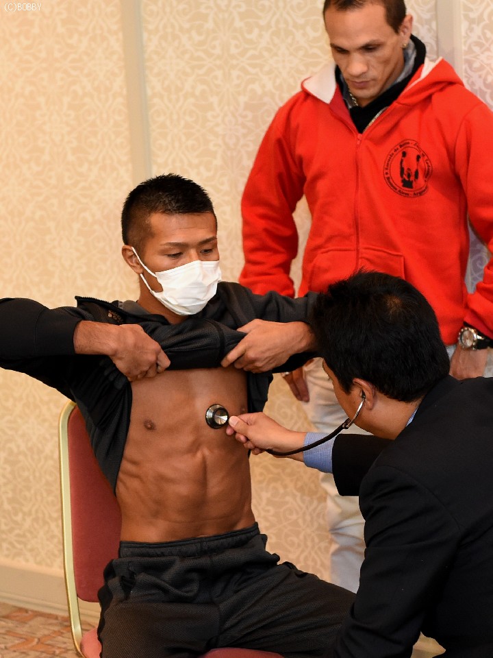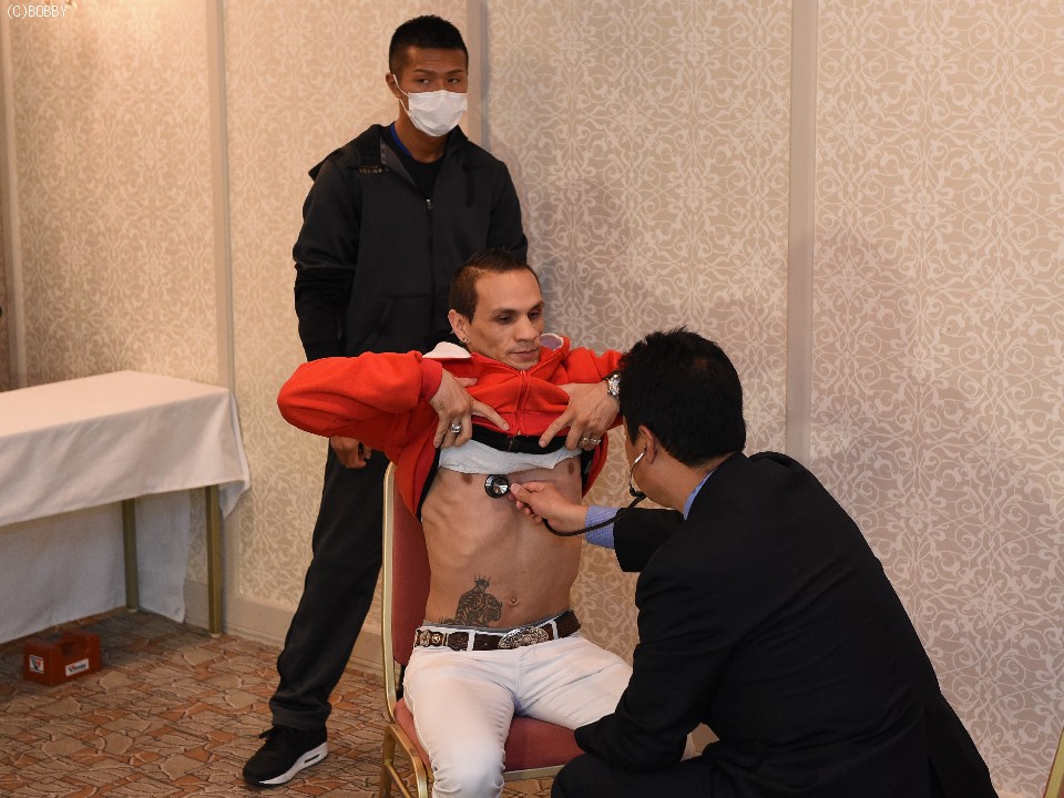 これがちょうど1年ぶりの実戦となる内山は「体重がちょっときつくなるかと思ったが、問題なかった。早く試合して勝ちたい」と、はやる気持ちを抑えきれない様子だった。予備検診と写真撮影の際、内山自身は気づかなかったというが、報道陣からペレスの右脇腹にタトゥーがあることを聞くと「的になりますね」と笑顔をみせた。