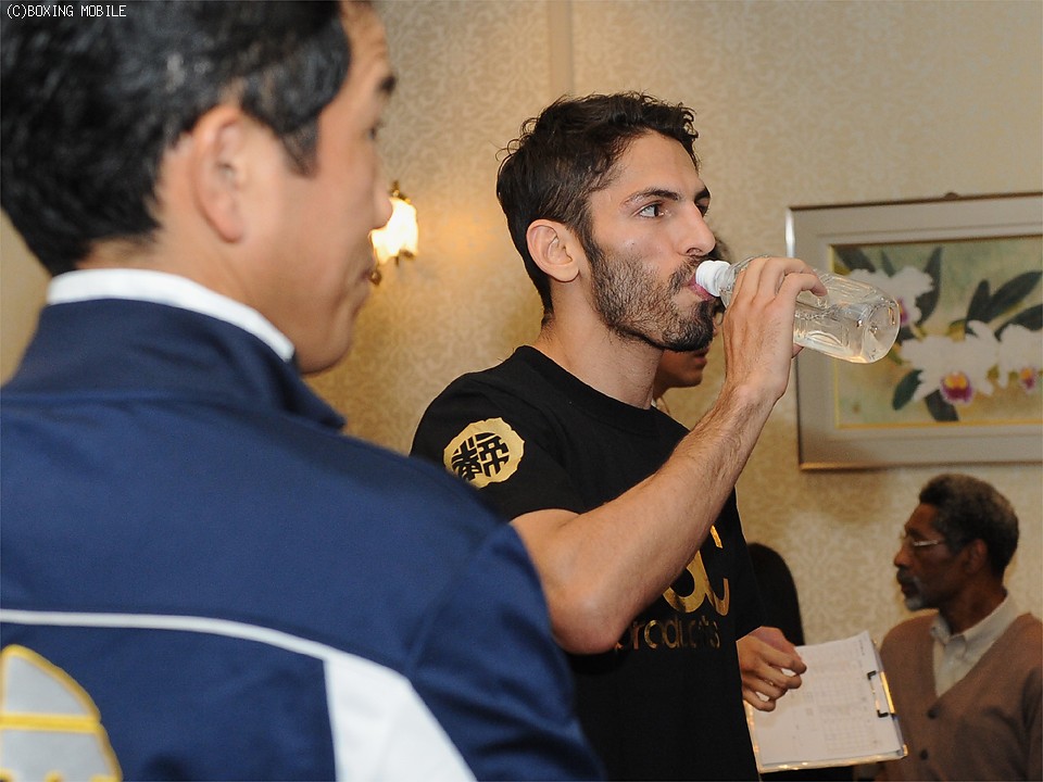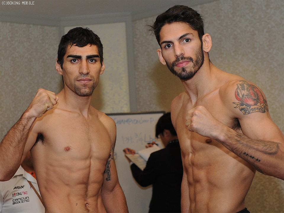 リナレスはライト級リミット61.2kgを100g下回る61.1kg、プリエトは61.0kgで計量をクリア。ホッと一息ついたのか、両者とも水をガブッと一飲みし、明日の決戦に向けコメントを残した。