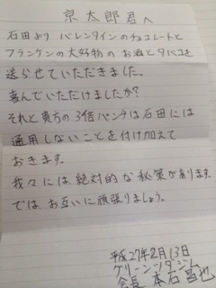 元WBA世界スーパーウェルター暫定王者で現日本ヘビー級1位の石田順裕(39=グリーンツダ)から、4月30日のチャンピオンカーニバルで挑戦を受ける日本同級王者の藤本京太郎(28=角海老宝石)に怒りのバレンタインチョコが贈られたと、角海老宝石ボクシングジムマネージャーの萩森健一氏が伝えた。