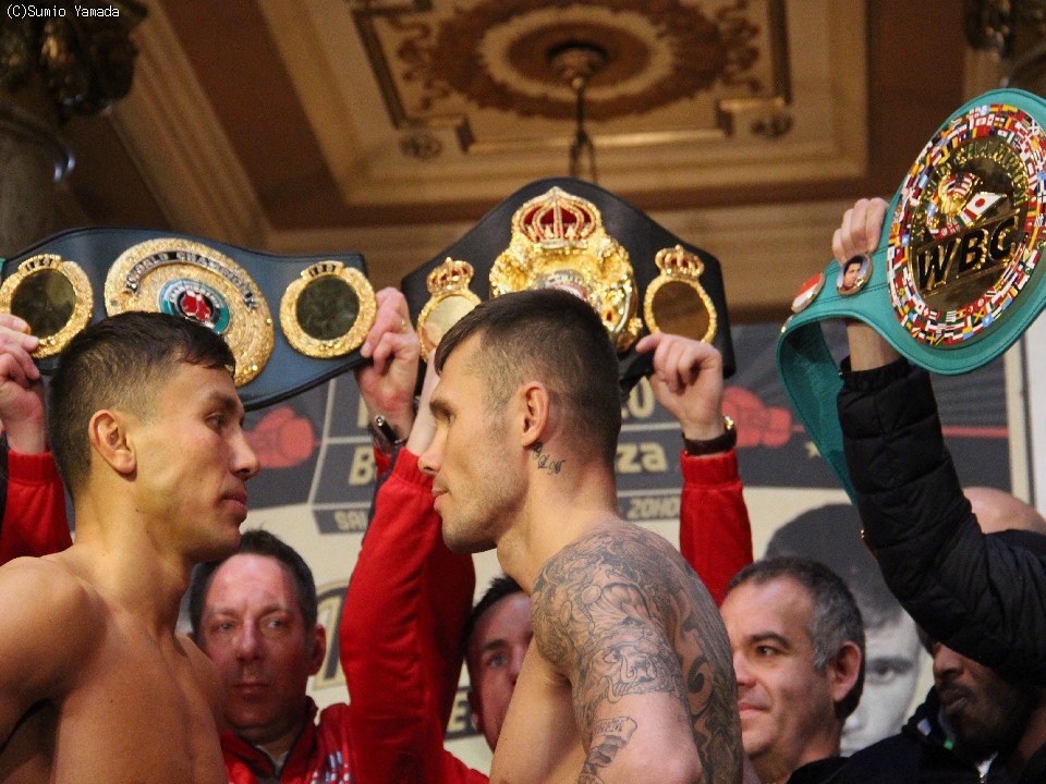 10年8月にWBA王座(当時は暫定)を獲得後、史上3位の12連続KO防衛を記録しているゴロフキンは、ミドル級リミット160ポンド(約72.5キロ)を1ポンド以上下回る158.9ポンド(約72.0キロ)で計量をクリア。「人生で最も厳しい戦いになるだろうが、勝つための準備をしてきた」と自信をみせるマレーは159.9ポンド(約72.4キロ)だった。戦績は18連続KO中のゴロフキンが31戦全勝(28KO)、マレーは31戦29勝(12KO)1敗1分。オッズはゴロフキン有利は変わらないものの前日の16対1から12対1に差が縮まった。