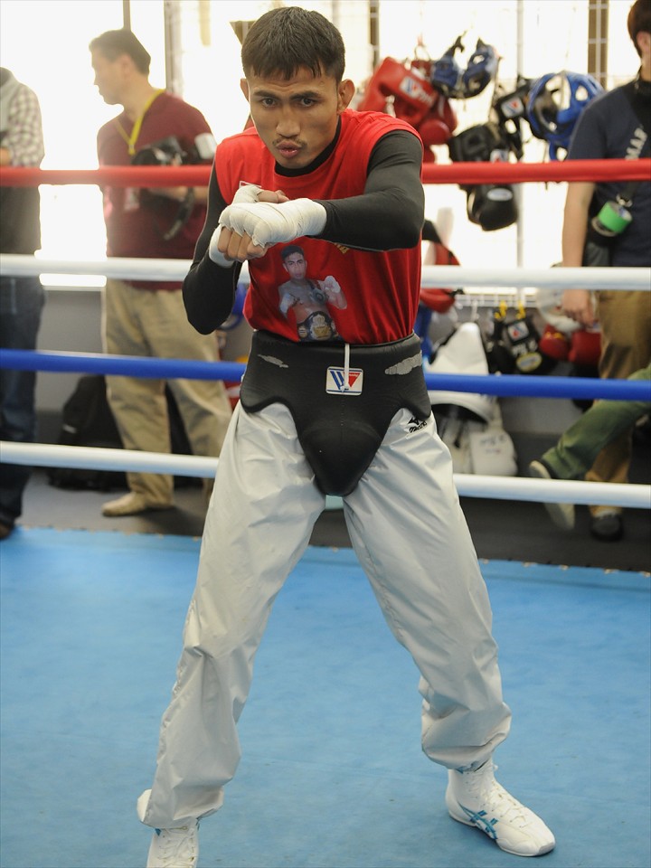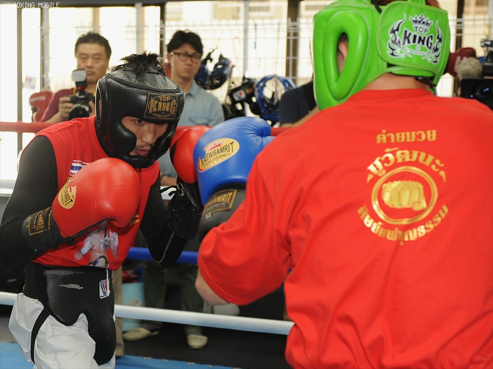 練習はシャドーとタイから一緒に来日したムエタイ・ミドル級王者を相手に2ラウンドのスパーリングを披露したが、軽く流す程度で参考にならず。動きを見つめていた佐々木修平トレーナーは、「汗が出ないし減量はキツそう。体の線も細いし、身長もそれほど高くはない。イメージ通りですね。油断は禁物だがサウスポーは得意」と自信を深めた。