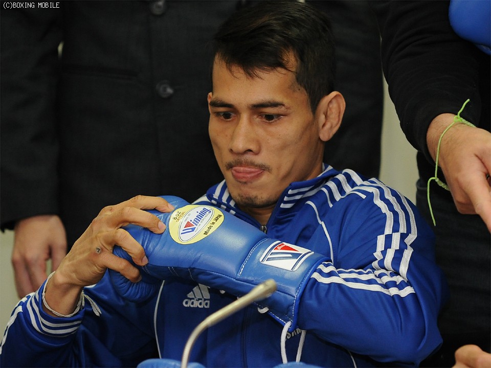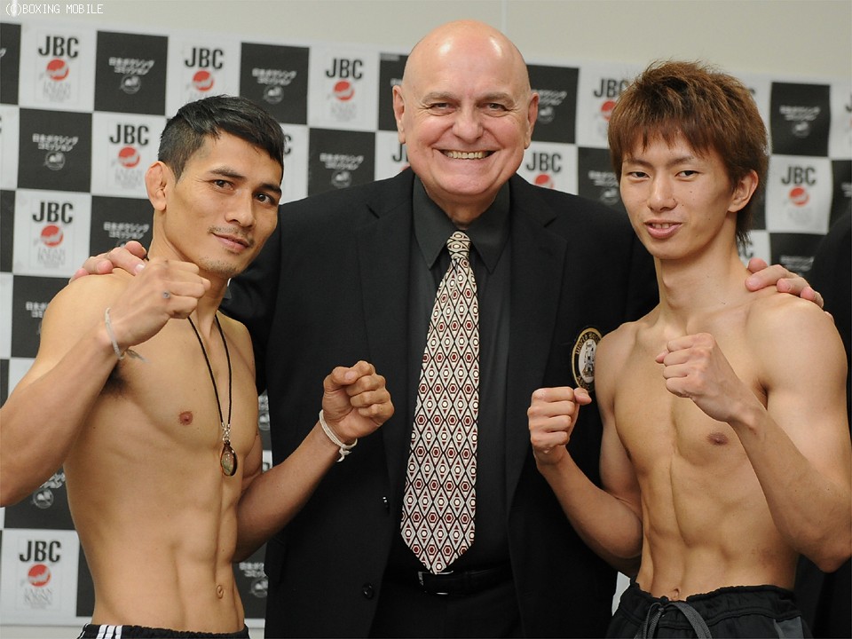 初防衛戦を明日に控えたWBA世界ライトフライ級王者の田口良一(ワタナベ)と挑戦者でランキング14位のクワンタイ・シスモーゼン(タイ)が5日、都内のJBC事務局で調印式と前日計量を終えた。