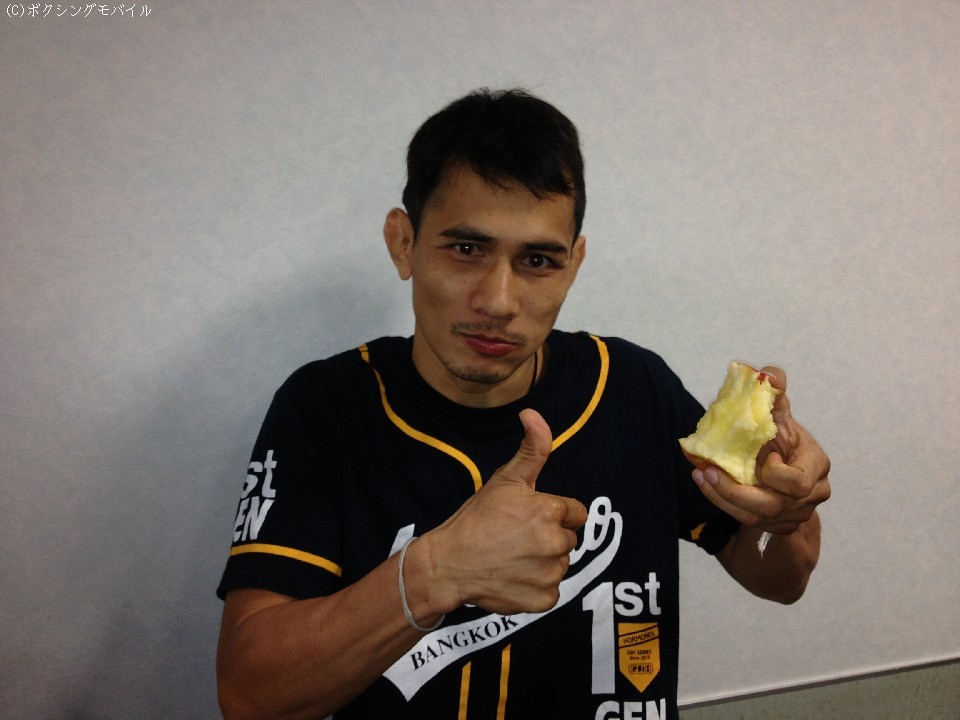 今回、タイでの調整がうまくいったというクワンタイは計量後は終始笑顔で、リンゴをかじりながら記念撮影にも応えた。