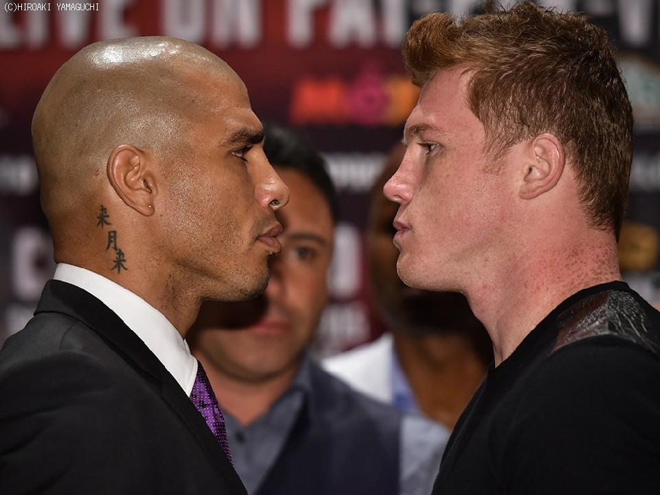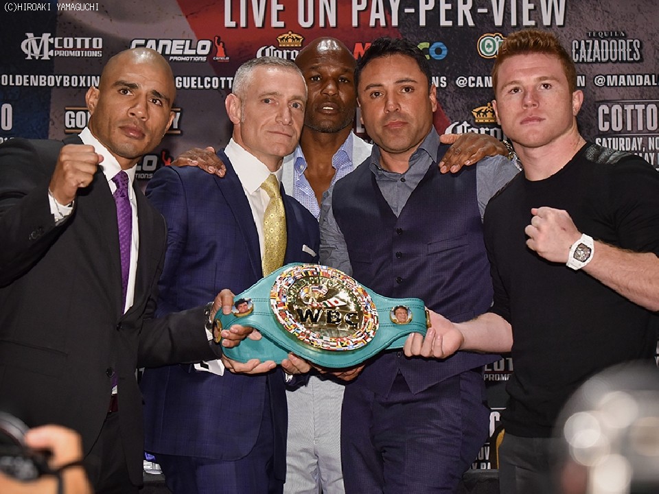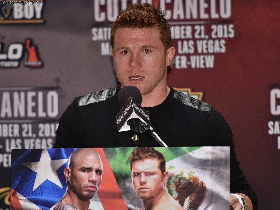 WBC世界ミドル級王者ミゲール・コット(34=プエルトリコ)と、前WBA、WBC世界スーパーウェルター級王者サウル・カネロ・アルバレス(25=メキシコ)が24日(日本時間25日)、米国カリフォルニア州ロサンゼルスで会見に臨んだ。両者は11月21日、米国ネバダ州ラスベガスのマンダレイベイ・イベンツセンターで拳を交えることになっている。