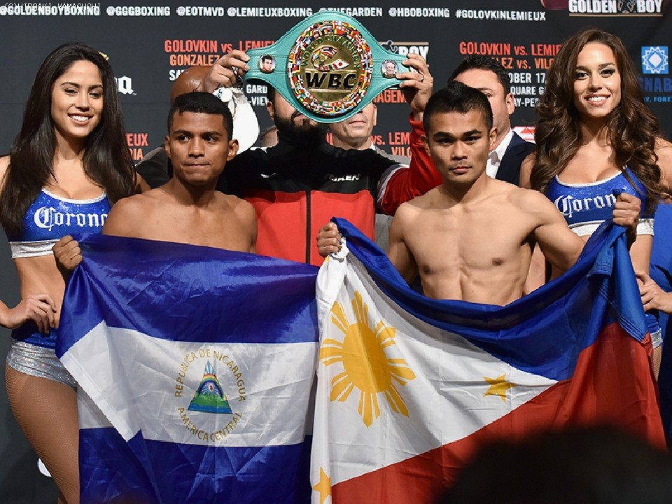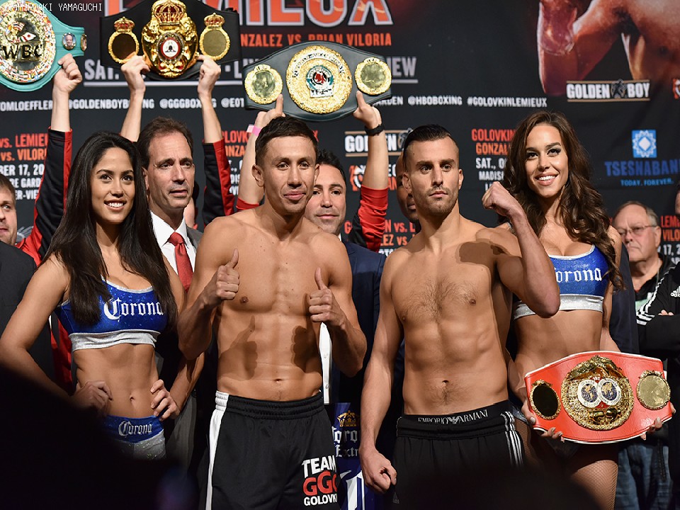 フライ級の方は、3度目の防衛を狙うゴンサレス、返り咲きを狙うビロリアとも111.4ポンド(約50.5キロ)だった。戦績はゴロフキンが33戦全勝(30KO)、レミューが36戦34勝(31KO)2敗。ゴンサレスは43戦全勝(37KO)、ビロリアは42戦36勝(22KO)4敗2無効試合。オッズはミドル級戦が11対1でゴロフキン、フライ級戦が10対1でゴンサレス有利と出ている。