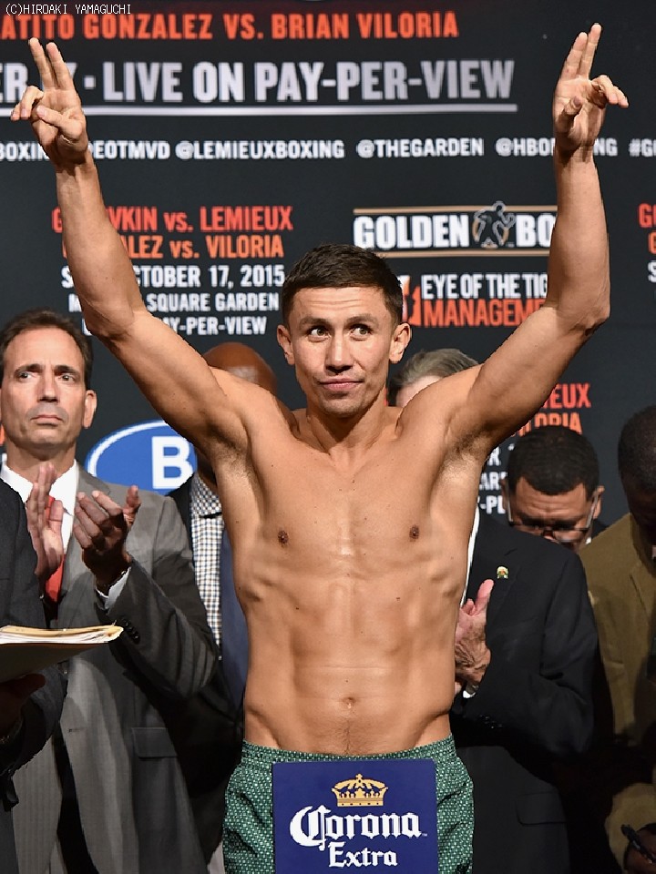 ミドル級王座統一戦、WBAスーパー王座&WBC暫定王座保持者ゲンナディ・ゴロフキン(33=カザフスタン/米)対IBF王者デビッド・レミュー(26=カナダ)の12回戦は17日(日本時間18日)、米国ニューヨークのマジソン・スクエア・ガーデン(MSG)で行われる。試合前日となる16日、ゴロフキンとレミュー、さらにダブルメインのWBC世界フライ級タイトルマッチに出場する王者ローマン・ゴンサレス(28=ニカラグア/帝拳)とブライアン・ビロリア(34=比/米)が計量に臨んだ。