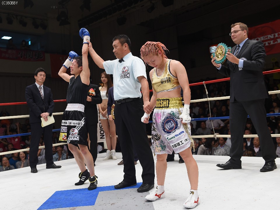 2ラウンドにも宮尾の右ストレートで鼻血を流しペースを取られたかに見えた小関だったが、ここからプレスを強め左ストーレートで宮尾の顔を弾く場面が増えた。出入りのボクシングをしたい宮尾だったが、パンチは単発になり小関が流れを引き戻した。5ラウンド終了時の公開採点は三者ともに47-47のイーブン。後半になっても小関の気迫溢れる攻めが勝り、ポイントを奪い続けた。劣勢の宮尾は前に出て右を決める場面もあったが、小関の左のヒット数が勝負を印象づけた。ジャッジは1者が1ポイント、2者が3ポイント差で小関を支持。セシリア・ブレークフス(ノルウェー)の持つ16度目の女子世界最多防衛記録に並ぶとともに2本のベルトを統一した。