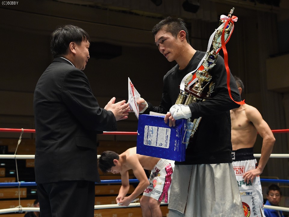 有川は今大会のMVPを獲得。副賞として賞金100万円を手にした。試合後、2回に右拳を骨折していたことを明かした有川。「過去にも3度折った経験があるので驚きはなかった。セコンドには言うと止められるかもしれなかったので言わなかった」と痛みを堪えた中で勝ち取った「最強後楽園MVP」の称号だった。試合の内容については「右ボディで(渡部が)『うっ』となったので手応えを感じた。離れてのジャブが当たったのも良かった」と振り返り、苦手にしていたサウスポーも少しは克服できたと喜んだ。