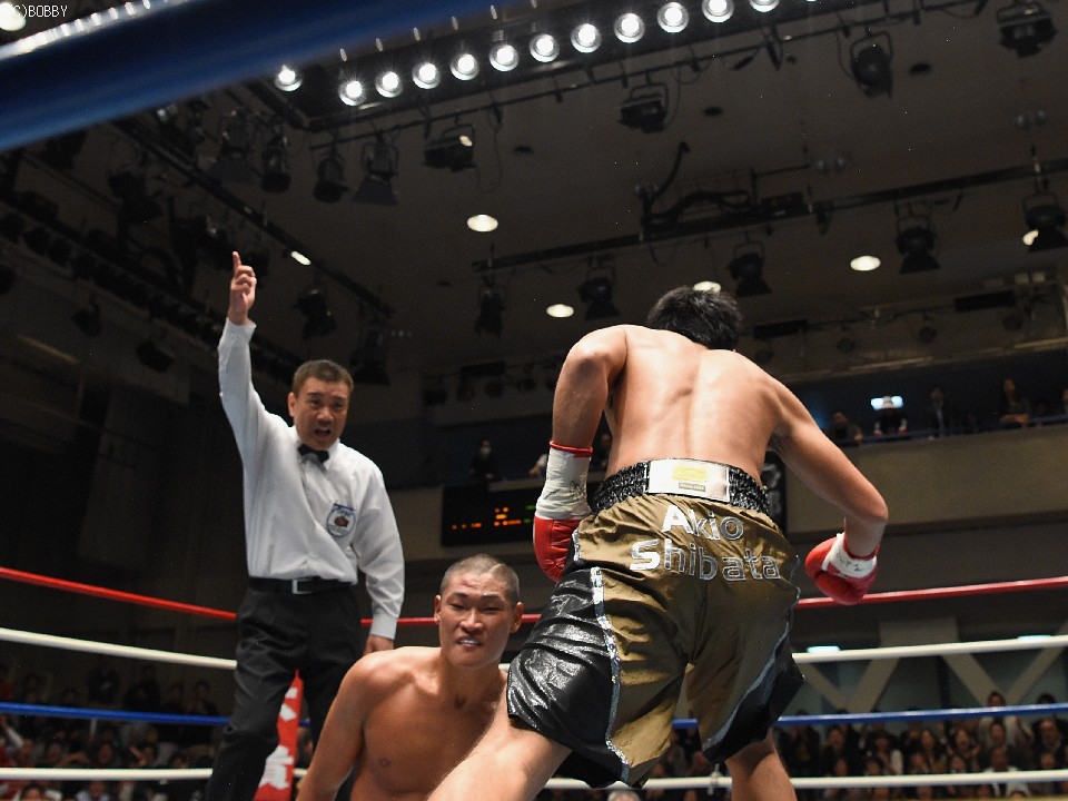 序盤で距離を掴んだ柴田は、4回までの途中採点を3者とも40-35のリードで折り返すと、5回からはあえて距離を縮め倒しにかかった。この回は前原の接近戦に付き合いすぎて左右のショートパンチを浴びたが、6回に入ると対前原用に磨いた左フックでチャンスを掴み、この試合で初めてパンチをまとめロープダウンを奪った。ここは切り抜けた前原だが、続く7回も柴田の右の長距離砲で弾かれると、一気に追い込まれ、最後は右を痛打されたところでタイミングよくレフェリーストップ。スピードで試合をコントロールした柴田が、最後は力ずくで挑戦者を退けた。