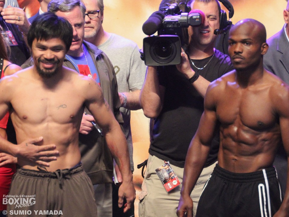 計量はブラッドリー、そしてパッキャオという順で行われ、ふたりともウェルター級リミット内で問題なくクリアした。計量が終わるとパッキャオは観客に投げキスを送るなどリラックスした様子だった。お決まりのポーズ撮影とフェイスオフ(睨み合い)でも笑みを絶やすことはなかった。戦績はパッキャオが65戦57勝(38KO)6敗2分、ブラッドリーが36戦33勝(13KO)1敗1分1無効試合。オッズは12対7でパッキャオ有利と出ている。セミのではWBO世界スーパーミドル級王座とルマッチが組まれており、こちらは6度目の防衛を狙うアルツール・アブラハム(アルメニア/独)、初挑戦のヒルベルト・ラミレス(メキシコ)とも階級リミットちょうどの168ポンド(約76.2キロ)だった。戦績は36歳のアブラハムが48戦44勝(29KO)4敗、24歳のサウスポー、ラミレスは33戦全勝(24KO)。オッズは17対11で挑戦者有利と出ている。