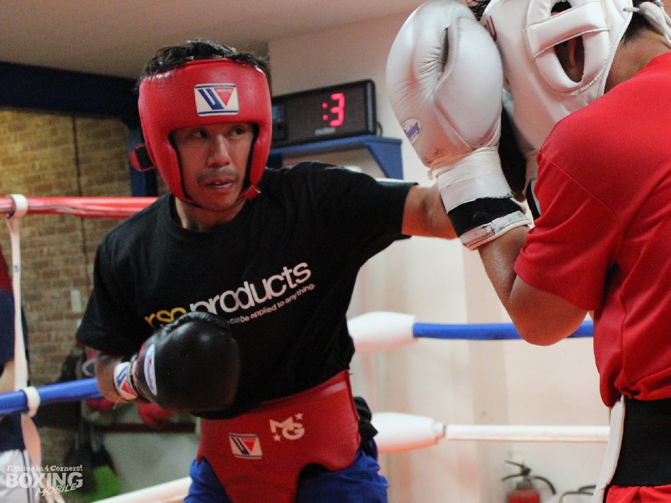 2013年12月のタイトル戦で死闘を繰り広げた村中とのスパーリングは、左を軸に多彩なコンビネーションを仕掛ける村中に対し、粉川はジャブから左ボディをヒット。ラウンド後半には飛び込んでの左フック、右アッパーで襲い掛かった。最後まで続いた両者のハイレベルな攻防にその場にいた関係者は目を奪われた。