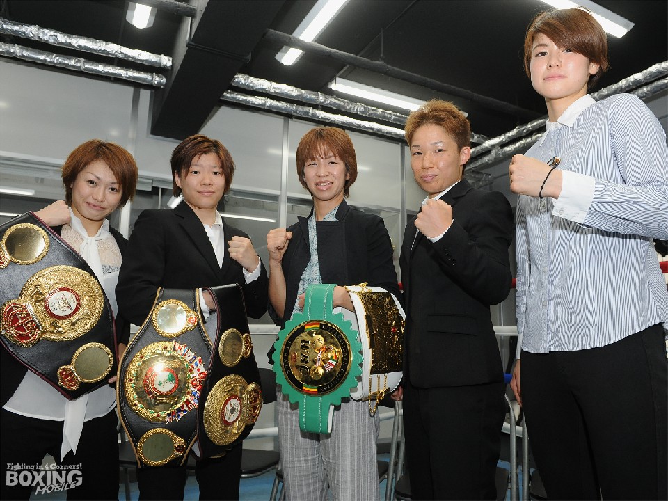 8日、都内のワタナベジムでは、9月21日(水)後楽園ホールで開催される「第2回DANGAN LADIES」のメインで世界タイトルに挑む江畑佳代子(40)、前座に出場する東洋太平洋女子スーパーバンタム級1位の後藤あゆみ(28)とB級デビューするチャオズ箕輪(28=本名・箕輪綾子)、そして先月13日にWBA女子世界ライトミニマム級王座を獲得した現役女子大生の古川夢乃歌(22)、その王座の元保持者で大橋ジムから移籍した宮尾綾香(33)の5選手が集い会見を開いた。