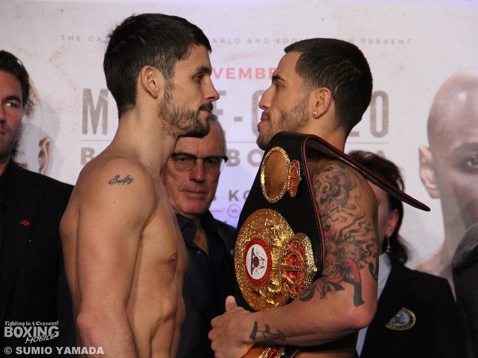 6月にハビエル・フォルトゥナ(ドミニカ共和国)に11回TKO勝ちを収めて王座を獲得したソーサは、初防衛戦を前に128.7ポンド(約58.4キロ)と軽めに仕上げた。これに対して4月のIBF王座への挑戦に続いて2度目の大舞台となるスミスは階級リミットいっぱいの130ポンド(約58.9キロ)だった。戦績はソーサが24戦19勝(15KO)1敗4分、弟のリアムに続いて4兄弟のうち2人目の世界王者を狙うスミスは26戦24勝(14KO)2敗。この試合の勝者はコラレス対内山の勝者との試合がWBAから義務化されているが、コラレスが勝ち残った場合はWBO王者ワシル・ロマチェンコ(ウクライナ/米)との統一戦が計画されており、まだ流動的な状況でもある。