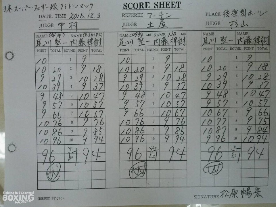 初回から尾川が迷うことなくプレスをかけて右をヒットしペースを掌握。序盤、動きの固い内藤は左を伸ばすが尾川は良く反応して被弾を回避した。その後は一瞬も目が離せないスリリングな展開で前半戦を終了。5ラウンド終了時の公開採点は3者ともに48-47で尾川がリード。6ラウンドになると手数の減ってきた尾川に内藤の左が機能しポイントを挽回した。追いつかれた尾川は8ラウンドから左フックをボディに集め足を止めにかかると、右ストレートで膝を揺らし試合の山場をつくった。最後は両応援団が大声援を送る中、お互いに一歩も引かない打ち合いで試合終了のゴングを聞いた。採点は3者ともに96-94で尾川を支持し3度目の防衛に成功するとともに再び内藤を退けた。