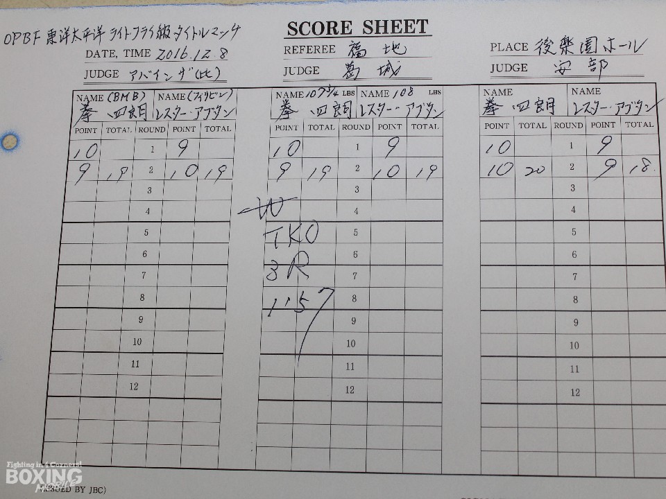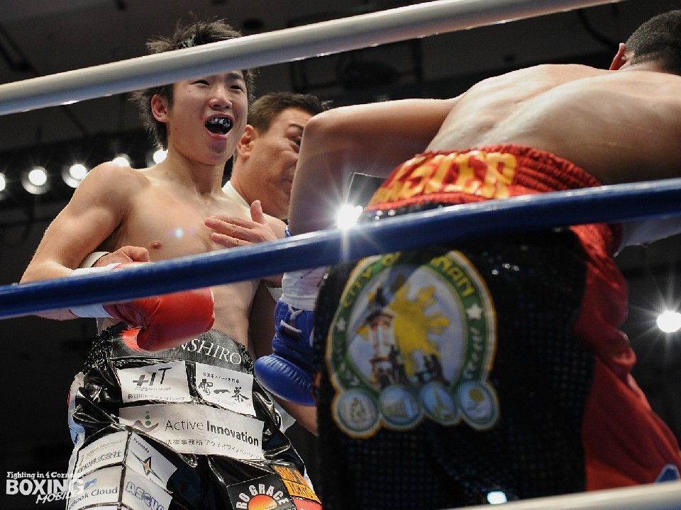 序盤、拳四朗が得意のジャブを飛ばすと右ストレートを好打。アブタンは思い切りの良い左フックを振り回すが拳四朗はバックスステップで被弾を回避した。すると3ラウンド、右カウンターを決めて大きく腰を沈めると怒涛の連打でロープダウンを奪った。再開に応じたアブタンだが反撃する力は残っておらず拳四朗が冷静にフィニッシュに持ち込んだ。