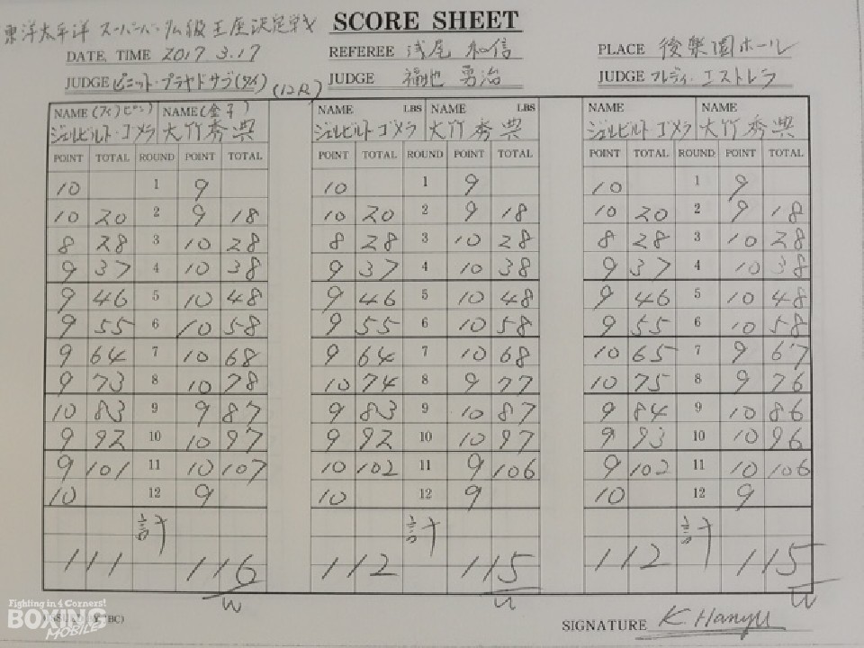 パンチを振り回すゴメラに手を焼いた大竹だったが、3回にプレスをかけて右ストレートでダウンを奪うと、4回終了時の公開採点は3者ともに38-37で大竹を支持。ペースを握った大竹は、その後も左ボディで動きを止めると連打でダウン寸前まで追い込んだ。ポイントをさらに広げた大竹は攻撃の手を緩めずダメージを与えた。最終12回はゴメラの左アッパーをもらいピンチになったが逃げ切りに成功。ジャッジは2者が115-112、1者が116-111とし大竹が新チャンピオンに輝いた。