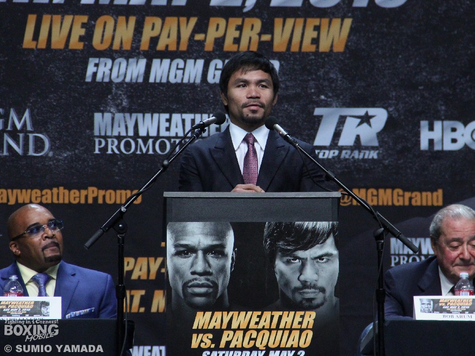 フィリピンの上院議員という肩書も持つパッキャオと、元教師というホーンはともにスーツ姿で会見に臨んだ。ホーンは世界的なスーパースターとの対戦に高揚した様子も感じさせ、「この場にいることが信じられない。たくさんの人のサポートを受けて夢がかなうことになったが、マニーから世界王座を奪わなければならない」と意欲をみせた。これに対しパッキャオは「若くてハングリーであるということがどういうことなのか、私には分かっている。彼は逃げずに正面から向かってくるタイプなので、ファンにエキサイティングな試合が提供できると思う」と話した。そして「そのためにホーンには十分なトレーニングを積んできてほしい」と注文もつけた。パッキャオ自身は28日にフィリピンに戻る予定で、それから約2ヵ月、集中トレーニングをすることになる。