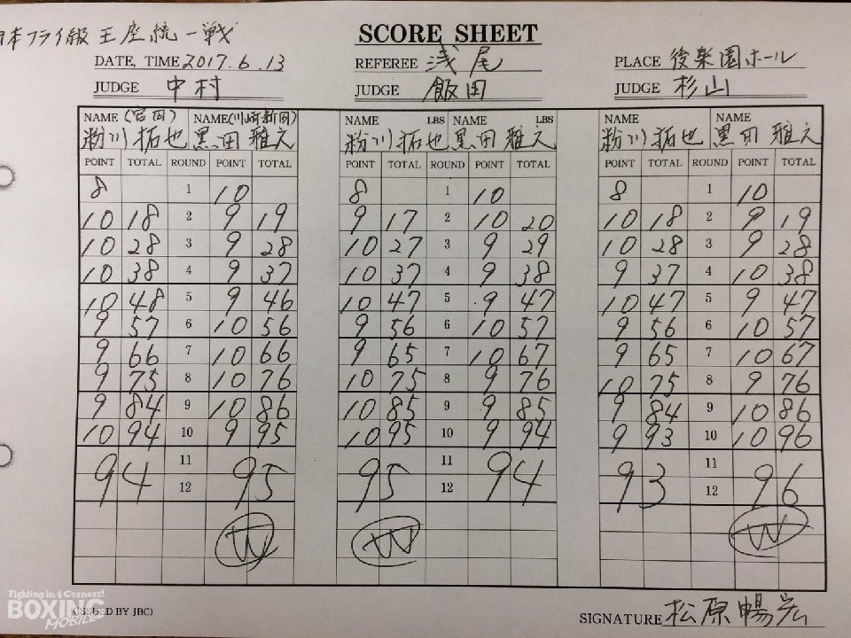 相手に流れを傾かせてしまった黒田は、後半に入ると多少の被弾は構わずペースアップ。左ボディから上に左右を返し、粉川の機動力に対抗した。終盤は頭をつけての激しい攻防が続き、粉川が右アッパーで黒田の膝を折れば、黒田も左フックを振り回すなど互いに譲らぬままゴング。後半は採点の振り分けが難しいラウンドが続き判定は割れたが、ジャッジ2者は暫定王者を支持。黒田がリベンジに成功すると同時に、日本フライ級王座を統一した。