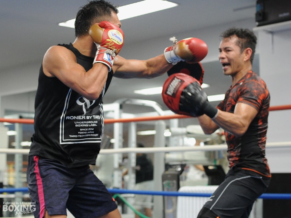 以前から赤穂亮(横浜光)と親交のある世界複数階級チャンピオンのノニト・ドネア(比/米)が緊急来日。8月に防衛戦を迎える日本バンタム級チャンピオン赤穂と26日、横浜光ジムで再会を果たすと早速、「世界のトップ戦線入りを目指せ」と稽古をつけた。