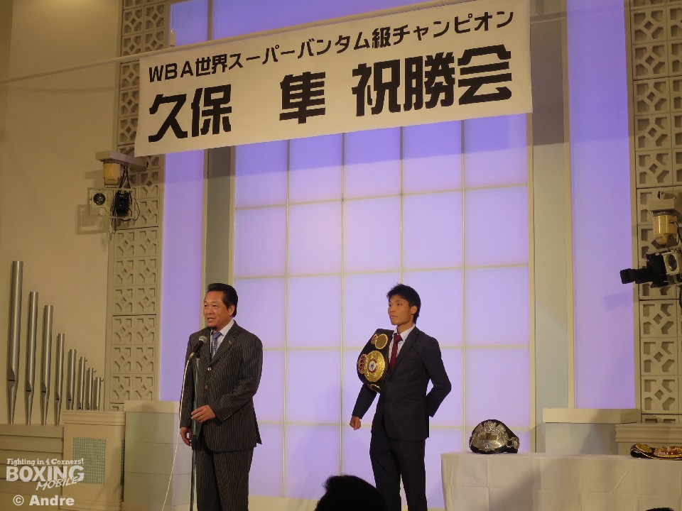 祝勝会の冒頭、山下正人会長は「本日はこのような会を開催していただき誠にありがとうござます。ご覧のようにまだまだ貫禄もない久保ですが、昨年引退した長谷川穂積のようにしっかりとした強いチャンピオンに育てていくつもりです。何卒応援よろしくお願いいたします」と、挨拶。