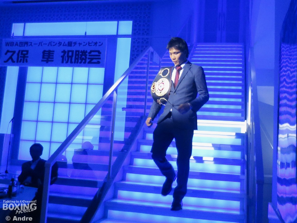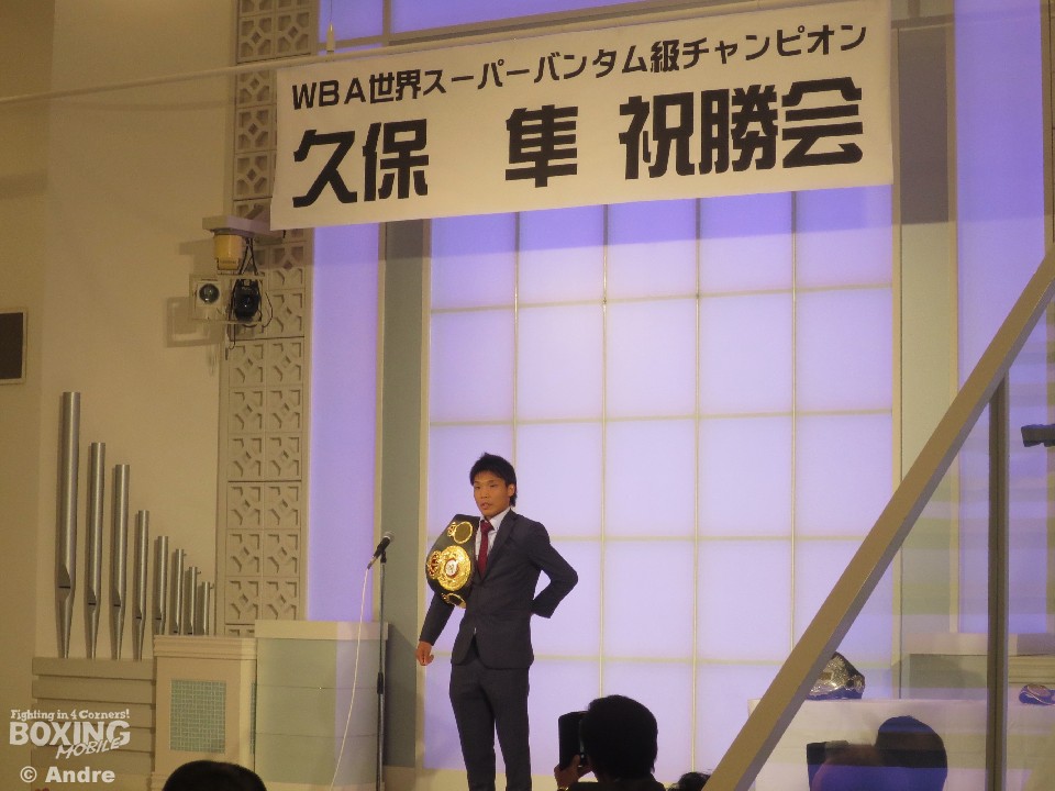 続いて、登壇した久保は「皆様本日はこのような会を開催していただきありがとうございます。皆様のおかげで世界チャンピオンになることができました。本当にありがとうございます。9月3日の初防衛戦もしっかりと勝っていきたいと思いますので、また応援よろしくお願いいたします」と、語った。