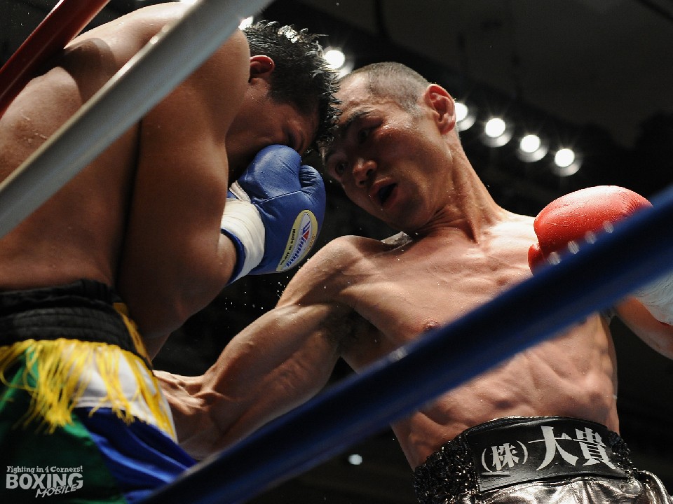 荒川は新たに取り組んだという左右への動きと、力まずに連打を意識したワンツー、ボディで立ち上がりから挑戦者を翻弄。ボディオンガンも踏み込んでは左ボディ、右クロスと強振するが、この日の荒川は反応もよく5回までにワンサイドの展開となった。すると6回、挑戦者が左ボディに耐え切れずダウン。再開後も一方的に打ち込まれ、成す術なしのボディオンガンをレフェリーが救出した。