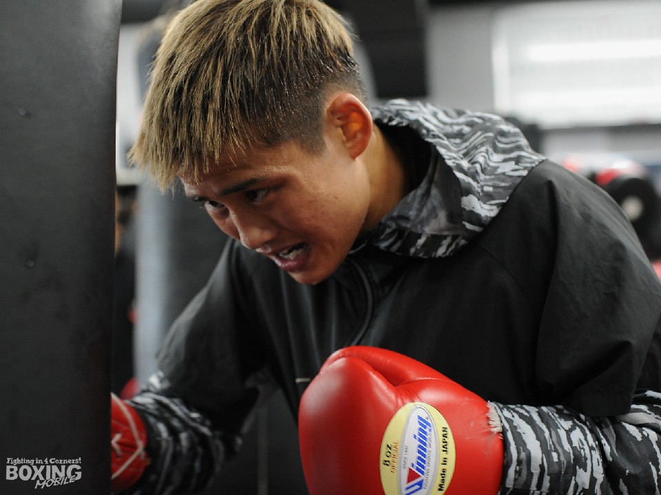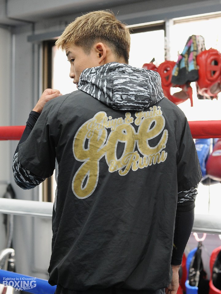 この日はシャドー、ミット、サンドバッグと最終調整に終始した京口。勝てば井上尚弥(大橋)の持つ1年6ヵ月を抜くデビュー最短での世界王座奪取記録を更新することになるが、京口は「そんなことは気にしていない」と話し、少年時代の恩師、元WBC世界バンタム級王者の辰吉丈一郎氏からもらったというブレーカーを着て汗を流した。