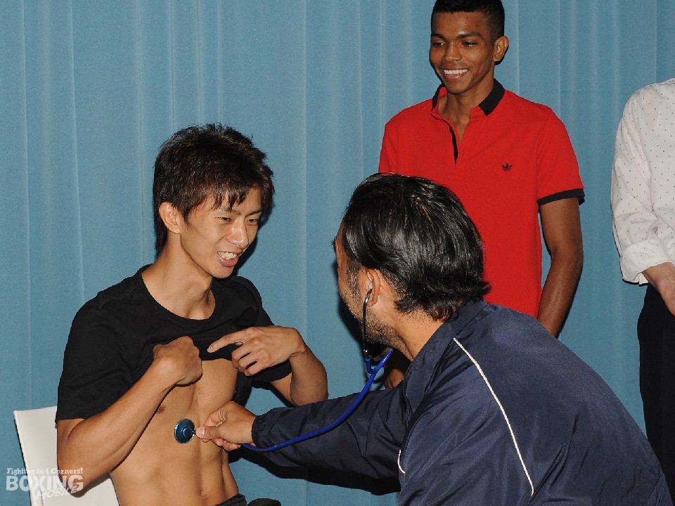 一方、7月20日はコロンビアの独立記念日で国旗柄のマフラーを巻いたバレラは「あとは計量を待つだけ。すでに体重はリミットにある」と仕上がりの良さをアピール。世界初挑戦ながら5度防衛中の田口に対し、「印象はまったくない。プレッシャーも感じない」と豪語した。また検診での挑発は「バレラは恐いとイメージさせたかった」と説明し、「田口はツヨカワと呼ばれいるそうだが、試合をすればベビーフェイスはモンスターのように腫れ上がるだろう」とつけ加え、「母国のため、息子のために必ずベルトを持ち帰る」と誓った。