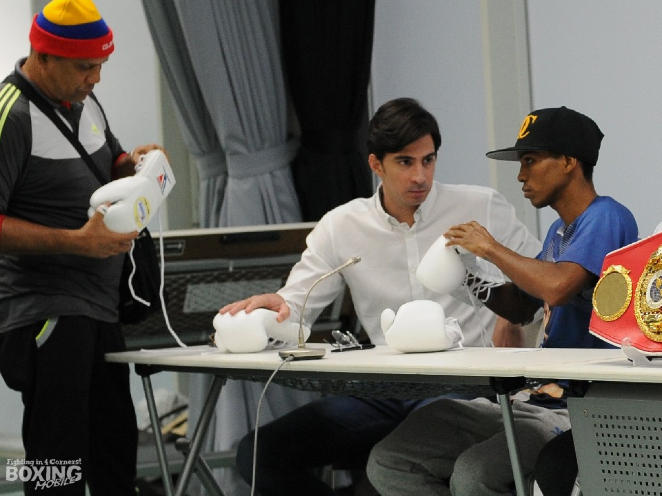 調印後のグローブ・チェックでは日本製ウィニングのグローブが用意され、田口はいつものように青、バレラは白を選択した。田口はV6戦クリアを前提にWBO世界同級王者の田中恒成(22=畑中)との統一戦が用意されるが、「今は意識せずに明日に集中したい」と話し、フォトセッションでは珍しく躊躇せず相手をにらみつけた。