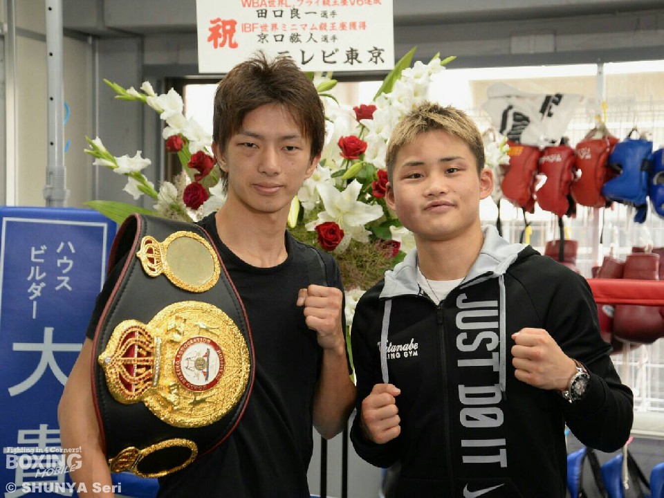 夏休み最初のボクシングダブル世界戦から一夜明けた24日、都内のワタナベジムで喜び会見が開かれた。6度目の世界王座防衛に成功した田口良一(ワタナベ)と日本人最速1年3ヶ月で世界王座奪取に成功した京口紘人(ワタナベ)。右頬っぺたを丸々と膨らませた状態で照れ笑いを浮かべて席に着いたのはIBF世界ミニマム級新チャンピオン。30戦目を終えてベテランの域に入ったとの自覚を示したのは、元祖強かわいいチャンピオン。会見の冒頭、席に並ぶと「強かわいいを継承します」と、王者の勲章を手で覆う後輩に目をやった。