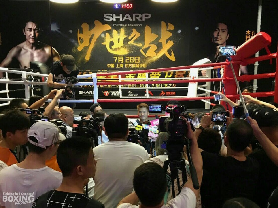 28日、中国の上海オリエンタルセンターでWBO世界フライ級王者ゾウ・シミン(36=中国)に挑む同級7位の木村翔(28=青木)が、DEF上海ジムで練習を公開。先に練習した王者と、入れ違い際に握手もかわした。「チャンピオンはさすが大スターのオーラを放って見えたが、身体は思っていたより小さいと感じた」とはそのときの木村の感想。木村と有吉会長とのミット打ちにも多勢の現地メディアが釘付けだった。調整は問題ないとのことだ。