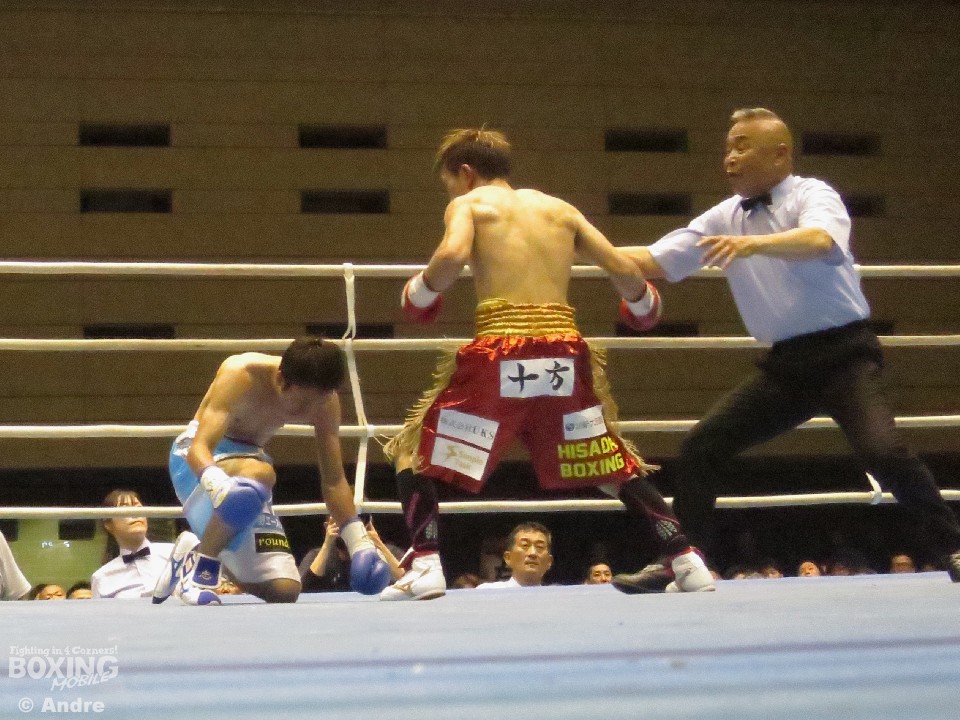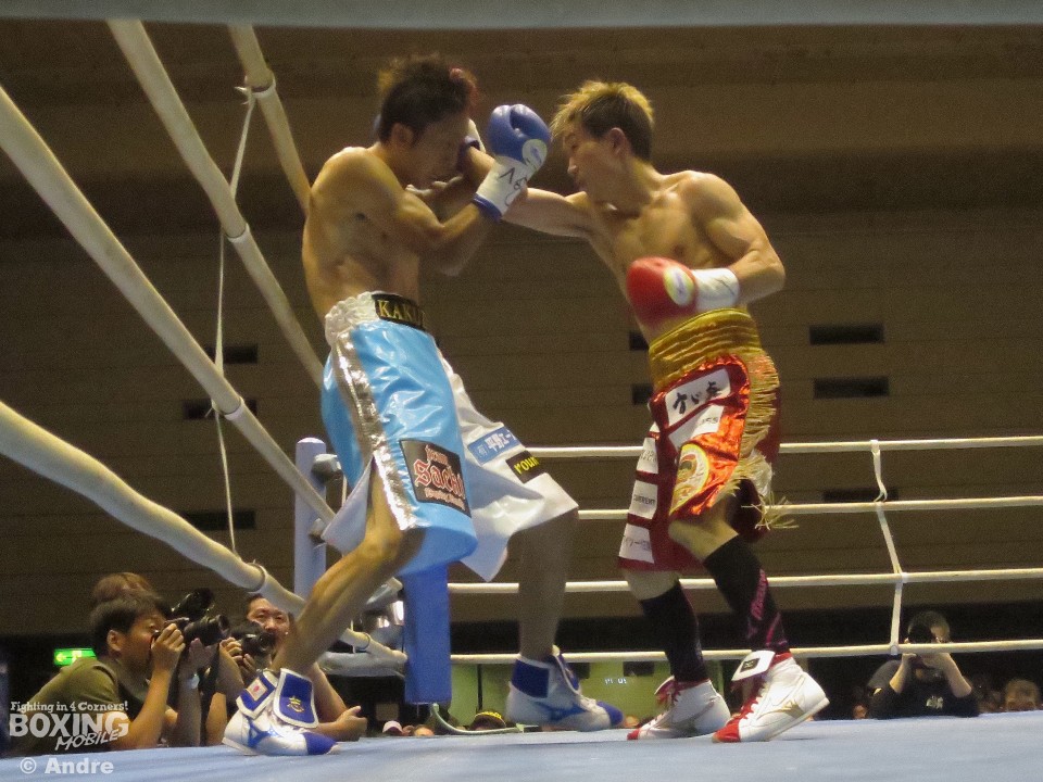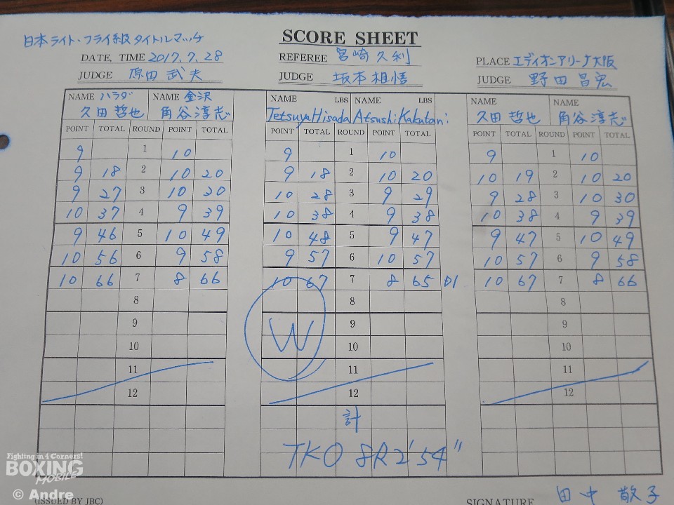 試合は、立ち上がり挑戦者の角谷がジャブからペースを握り、ポイントを集める。元々スロースターターのチャンピオンの久田は角谷の出方を伺いペースを奪われる形となった。5ラウンド終了時点での途中採点は1者が王者の久田を支持したものの、2者が最大3ポイント差をつけチャレンジャーの角谷を支持。迎えた6ラウンド、猛然と前に出たのは久田。左右のボディからフックをあてる。角谷も打ち終わりを狙うが、スタミナが切れ失速。7ラウンド、久田が左フックを振り抜きダウンを奪うと、続くラウンドでラッシュでレフェリーストップに持ち込み初防衛に成功した。
