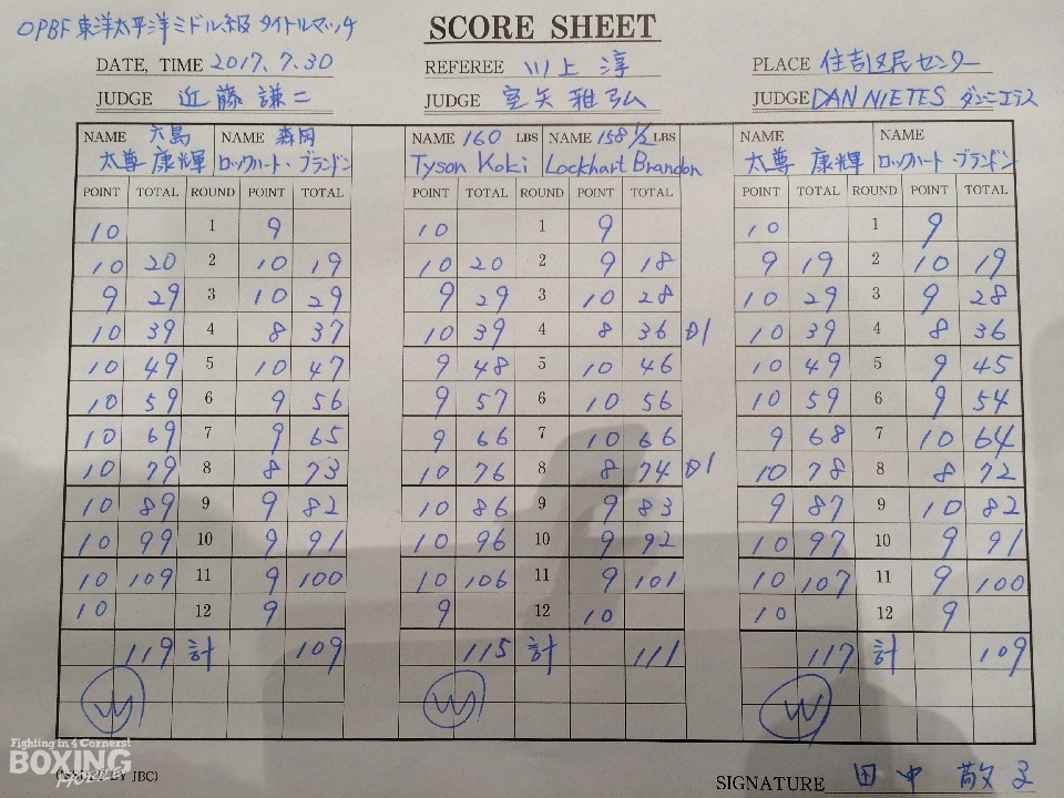 試合はサウスポー太尊がジャブを突きながら左ボディをヒット。力強い右フックでダメージを与えたいロックハートだが身長差22pある太尊にクリーンヒットを奪うことができない。この日の太尊は決して熱くならず冷静にワンツーを決めて着実にポイントを加点すると4回にワンツーでダウンを奪った。4ラウンド終了時には39-37×1、39-36×2でリードを奪った太尊はロックハートの攻撃をバックステップで回避するとワンツーを決め、8回に左ボディストレートで2度目のダウンを演出した。8回終了時にさらにポイント差を広げた太尊だったが10回にロックハートの左フックを浴び膝を揺らしたが、最後まで距離を保ちポイントを稼いだ。4〜10ポイント差をつけて太尊が2度目の防衛に成功した。