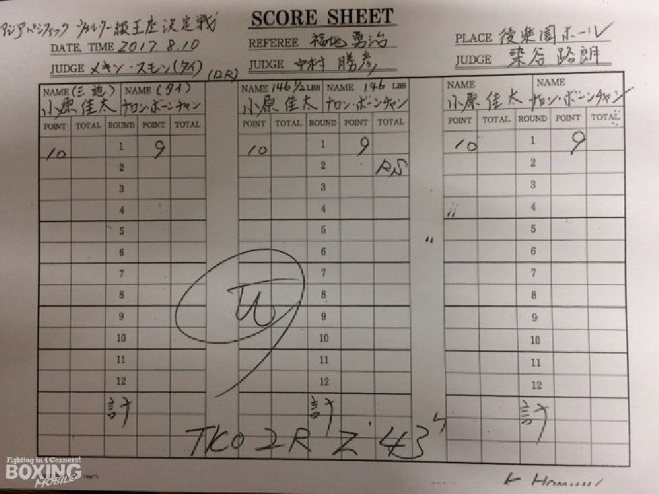 小原の強打を浴びてキャンバスに沈んだナロンは「相手はパンチがあると思わなかったが、左フックが効いて崩された。身長差があり、戦いずらかった」と強さを認めていた。
