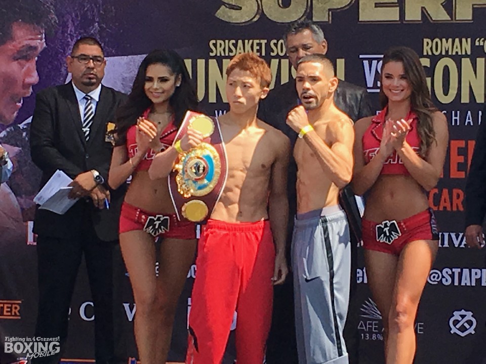 アプリをダウンロードして、個人情報とクレジットカード情報を事前に登録し、現在地と目的地を入力すると、7〜8分で自分の目の前まで迎えに来てくれる、有料のヒッチハイクサービス「Uber」を利用し、法律や生活環境・文化の違うアメリカで、郷に行けば…の精神で、この国の当たり前に戸惑いながら会場入り。アウェイとはこういうものかー。日本との時差16時間の地で時計に目をやると、米国西海岸時間の9月8日(金)13時。カリフォルニア州カーソンにあるスタブハブセンターで、HBO局の人気ボクシングマッチ番組「アフターダーク」の前日計量が始まった。今週末は、スーパーフライ級祭り!シーサケット・ソールビンサイ(タイ)、ローマン・ゴンサレス(ニカラグア)、井上尚弥(大橋)、アントニオ・ニエベス(米国)、カルロス・クアドラス(帝拳/メキシコ)、ファン・フランシスコ・エストラーダ(メキシコ)が次々に計量台に上がった。