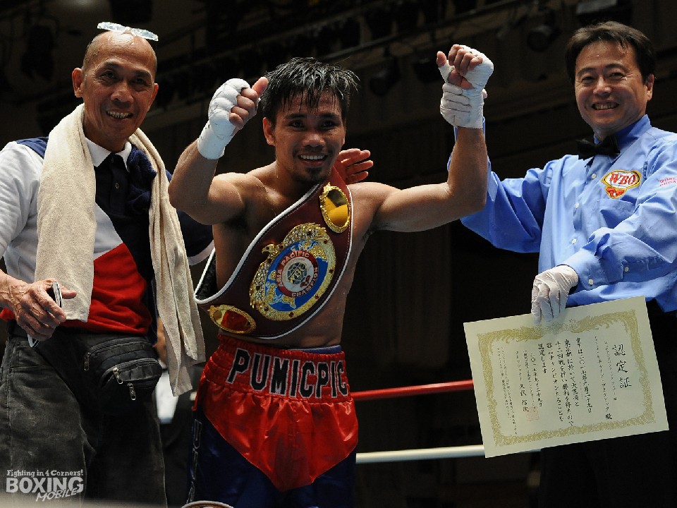 日本での初勝利を挙げ、世界ランク入りが確実となるWBOアジアパシフィック王座を獲得したプミクピック。控室に戻っても上機嫌に「ベリーハッピー」と満面の笑みを見せたが、「アマガサは背が高く、パワーもあって強かった」と称えることも忘れなかった。勝因についてはジャブを外して左フックで飛び込む、天笠用の戦法が最後まで功を奏したとし、今後はフィリピンと日本で試合をしていきたいと鼻息を荒くした。