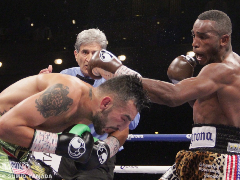 スーパーウェルター級のトリプル世界戦は14日(日本時間15日)、米国ニューヨークのバークレイズ・センターで行われる。試合を翌日に控えた13日、WBA(世界ボクシング協会)スーパー王者エリスランディ・ララ(34=キューバ/米)と同級6位の挑戦者テレル・ゲシェイ(30=米)、WBC(世界ボクシング評議会)王者ジャメール・チャーロ(27=米)と同級1位の指名挑戦者エリクソン・ルビン(22=米)、IBF(国際ボクシング連盟)王者ジャレット・ハード(27=米)と同級11位の挑戦者オースチン・トラウト(32=米)の6選手が計量に臨んだ。