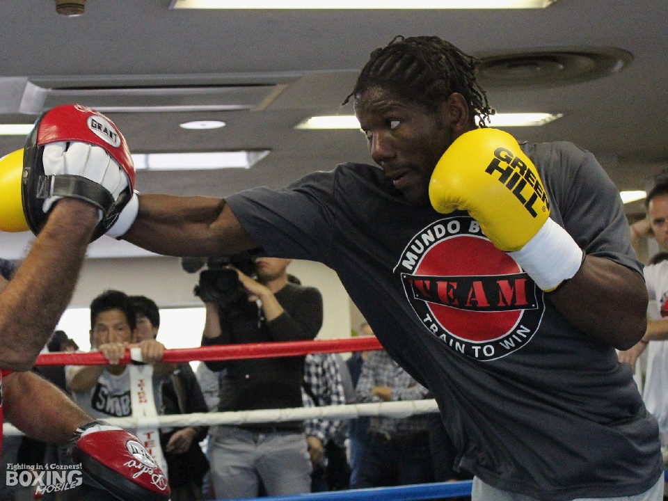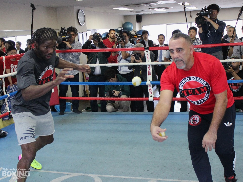 会見後の練習ではロープを飛んだ後、ミット打ちを1ラウンド披露。パンチを打ち抜かず、軽めのパンチでコンビネーションの確認を行うと、左ガードの位置を入念にチェックしていた。その後、お面のマスクをつけたサンドバッグ打ちではキューバ人のペドロ・ディアストレーナーにフォームを細かく修正されていた。